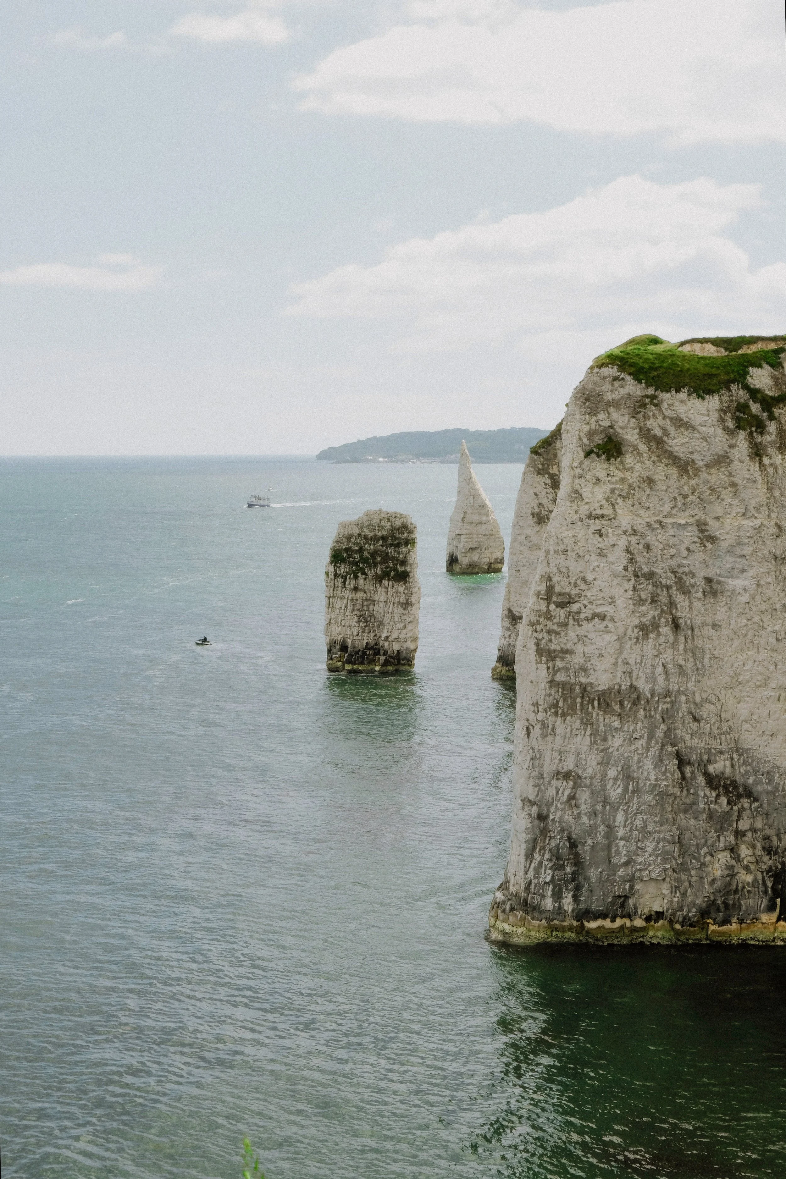 Foxgloves, ferns, wildflowers and long grasses – all humming with the sound of busy insects – dot the route. We soon arrived at the view we had wanted to see: Old Harry Rocks and the Pinnacles. These unique rock formations jut out into the sea, their white chalk composition a striking sight against the blue waves and seafoam. Old Harry Rocks is reputedly named after an infamous Poole pirate, whose ship hid behind the rocks awaiting passing merchants. The rocks mark the most eastern point of the Jurassic Coast. We sat for a break in the grassland, enjoying views of the Pinnacle stack.