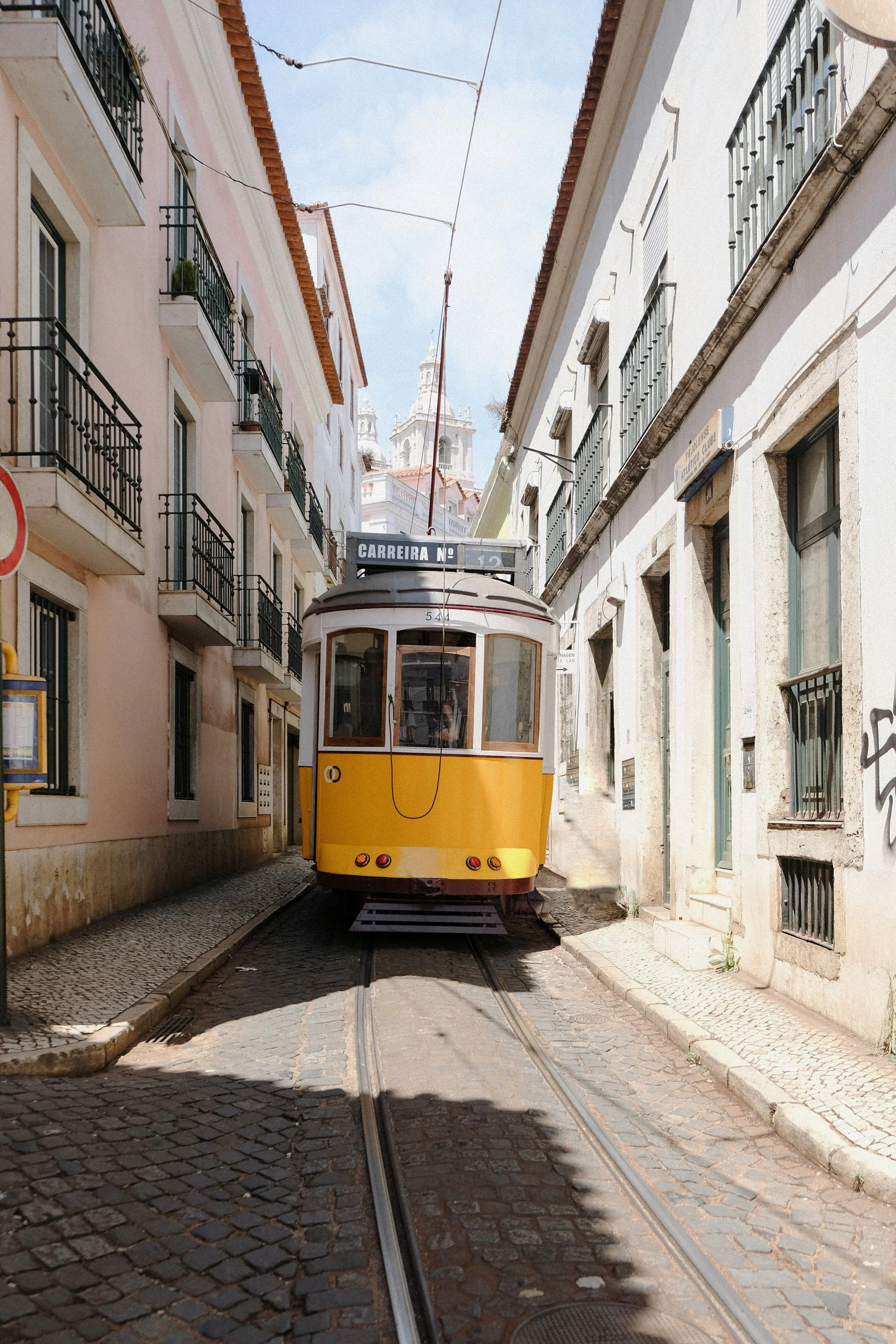 We left London on 21 June on an early flight that landed in Lisbon at 10:30am. This allowed us the afternoon to explore some of the fantastic miradouros (Santa Luzia and Portas do Sol) and the famous route of Tram 28. Tram 28 is a 4.5 mile route between Martim Moniz Square and Campo de Ourique. This famous sunshine coloured streetcar adds an extra charm to the already picturesque streets. On our first day we saw the trams at Rua das Escolas Gerais and Sé Cathedral. Other lovely details of the city included the hypnotic tiling of Rossio Square, a repetitive swirly pattern of white and black tiles; fresh produce stalls selling glossy cherries and ripe tomatoes and bushes of bougainvillea in full bloom. Their magenta petals framed the city’s iconic azulejo tiled walls beautifully.